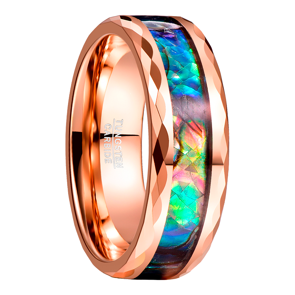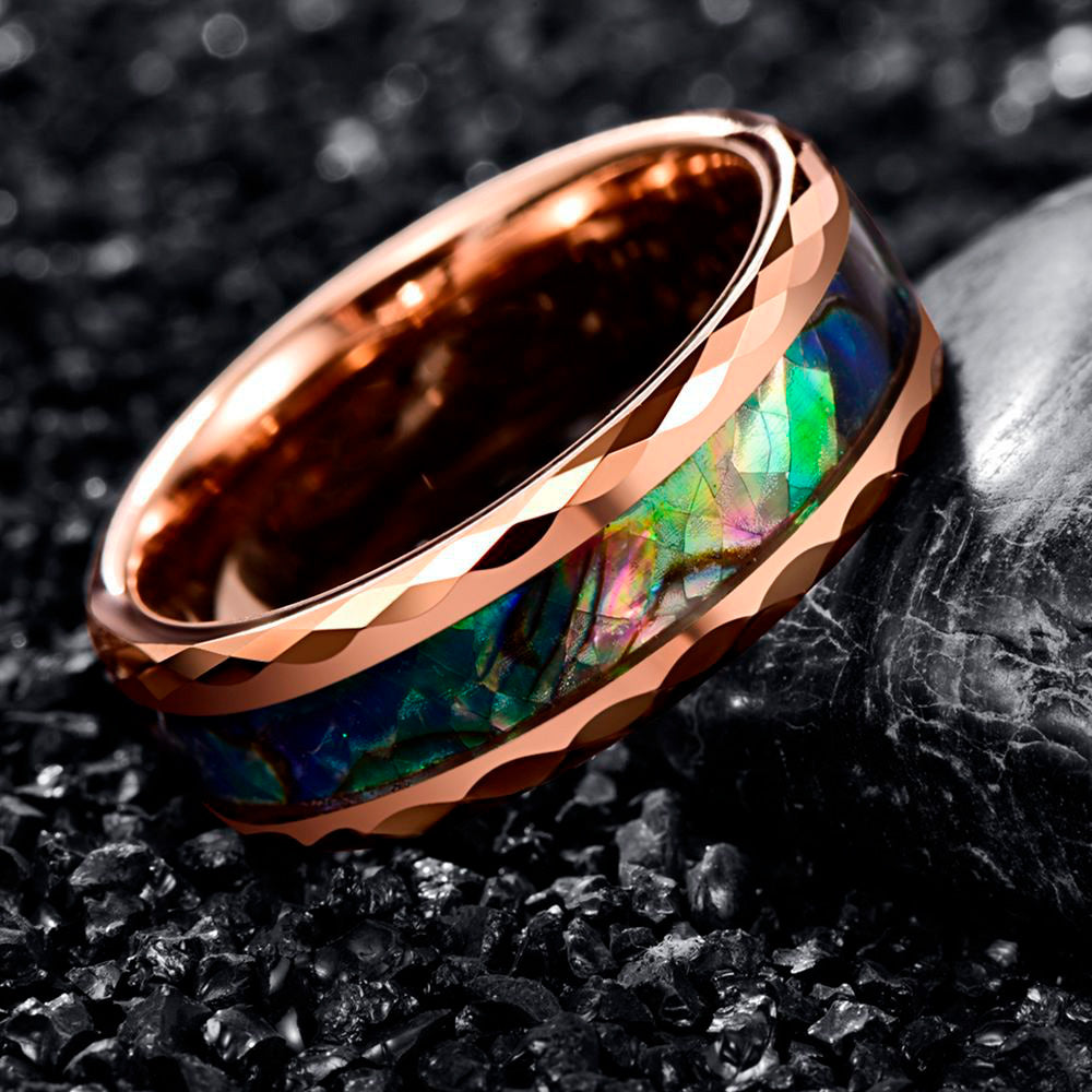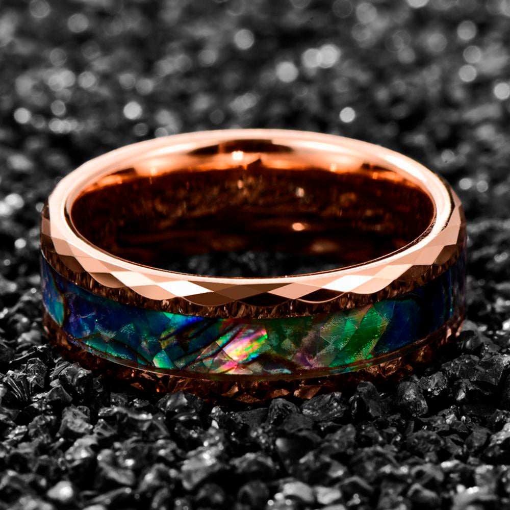 Experience the shimmering beauty of Aurora — a rose gold tungsten carbide ring featuring a stunning iridescent shell inlay that reflects a spectrum of colors with every movement. The faceted edges add extra brilliance, enhancing the natural glow of the rainbow-like surface and creating a captivating play of light.