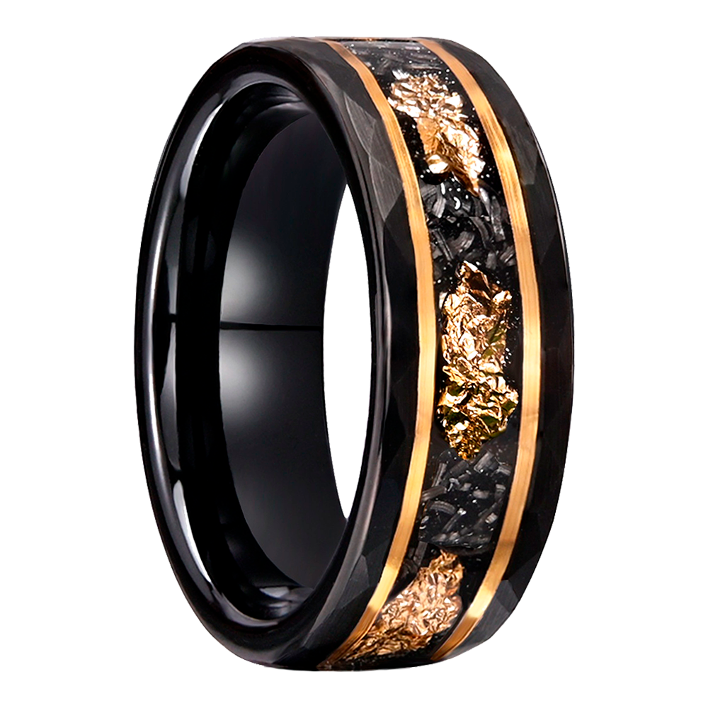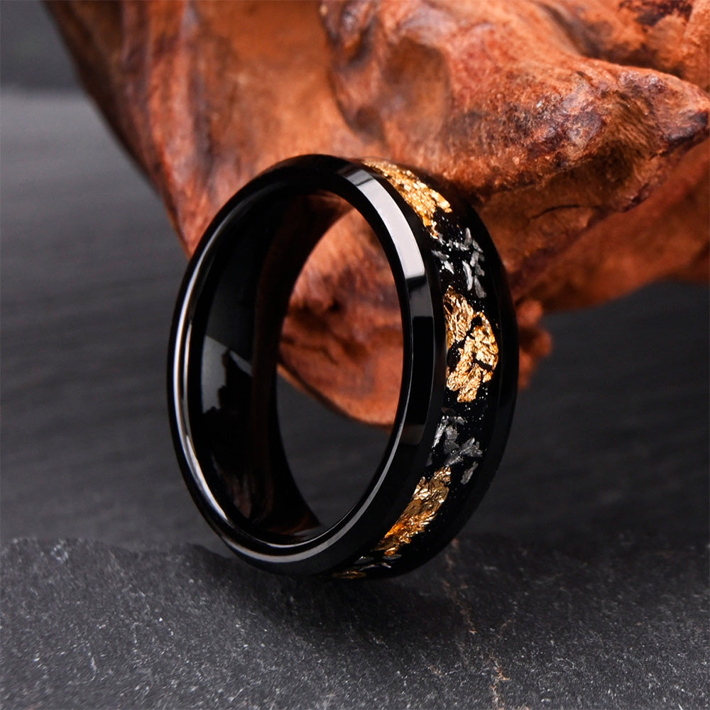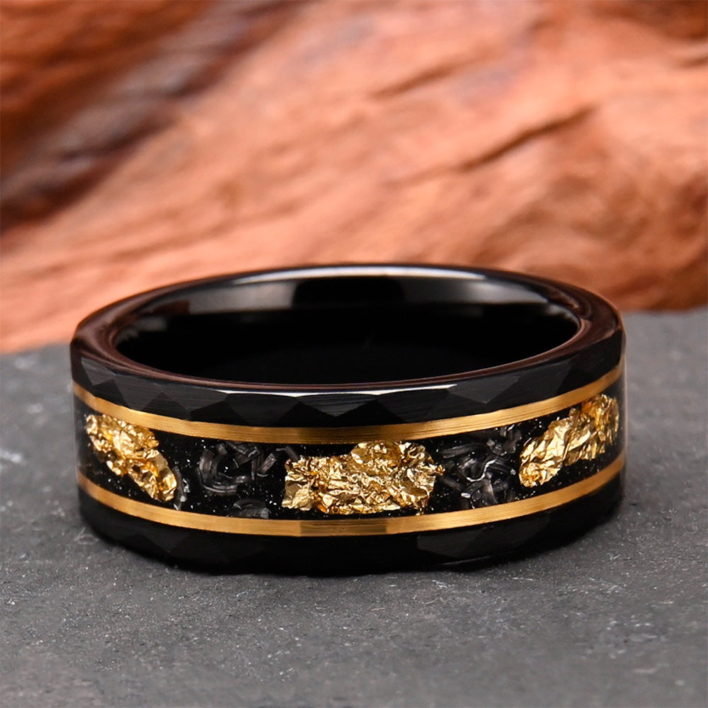 Discover the striking elegance of Scintilla Nera — a bold tungsten carbide ring featuring a deep black finish and a shimmering metallic crystal inlay. The faceted edges and reflective textures create a dynamic play of light, making this piece stand out with a unique sense of depth and sophistication.